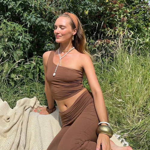 The Aroha One Shoulder Top is designed for multiple occasions. The One Shoulder features a single layer with a shelf bra and zig zag finishing.