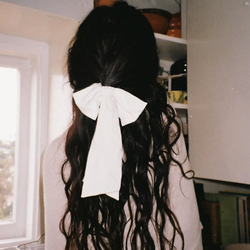 A medium sized bamboo elasticated scrunchie with a bow to be worn in hair or on wrist.